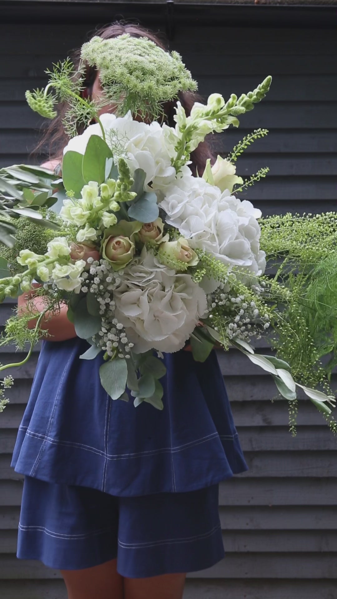 WIld, yet elegant. White hydrangea, roses, lacy bishops flower, snapdragon with added texture from green bell and asparagus fern.